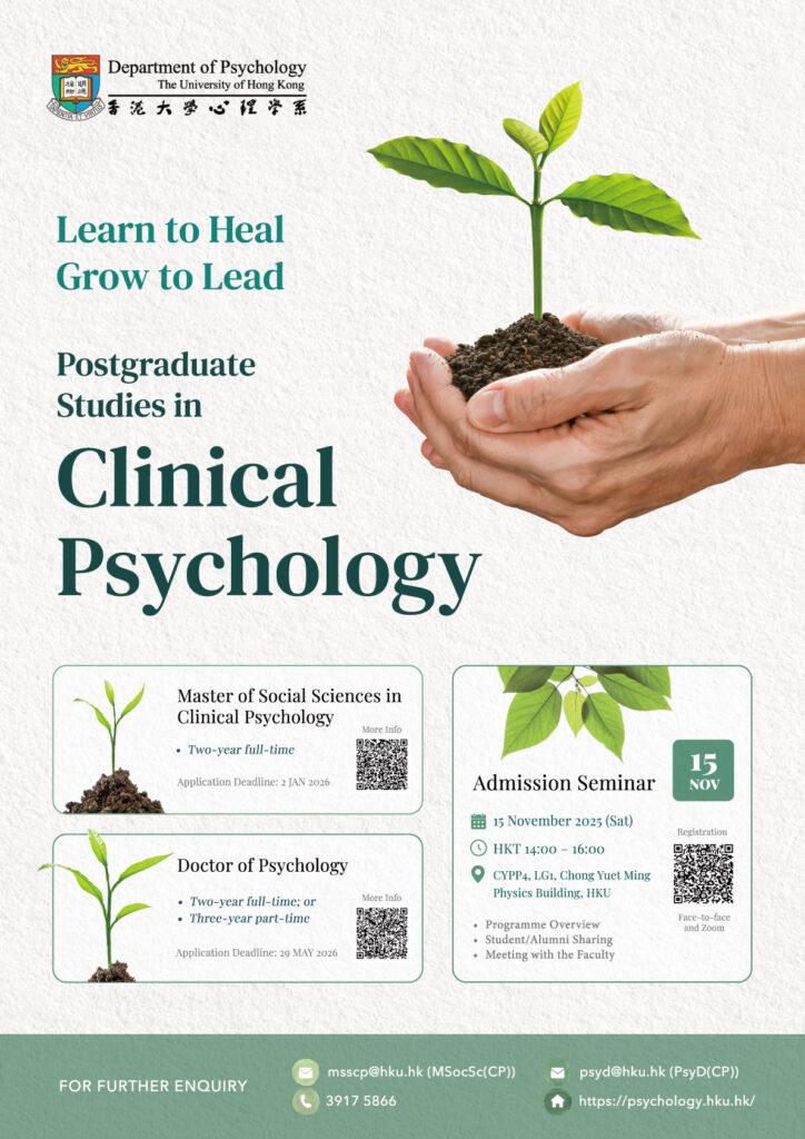 Clinical Psychology is a scientific discipline that aims to understand, prevent, and relieve psychological distress and dysfunctions, as well as promote well-being and personal development. Clinical Psychologists are mostly employed in hospitals, government sectors, counseling services units and voluntary organisations. Common duties of clinical psychologists include conducting psychological assessment, psychological intervention and counseling, giving public educational talks and workshops, providing staff training and consultation, as well as conducting scientific research. The Department of Psychology of HKU offers three postgraduate programmes in clinical psychology, including the Master of Social Sciences (MSocSc) in the field of Clinical Psychology Programme, The Doctor of Psychology (PsyD) in the field of Clinical Psychology Programme and the Doctor of Philosophy (PhD) with Specialization in Clinical Psychology Programme.