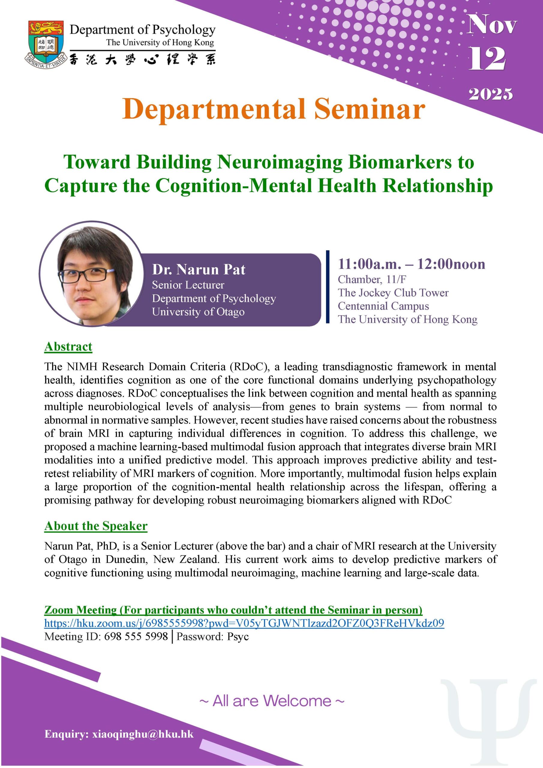 Departmental Seminar – Toward Building Neuroimaging Biomarkers to Capture the Cognition-Mental Health Relationship Details: 20251112_Narun Pat_Purple Print